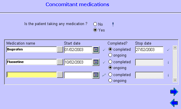 To disable the start date field in each row until a medication has been entered, use the following 'Collect if' condition: