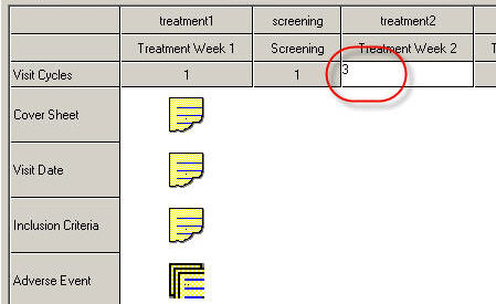 To make a repeating visit, click in the Visit cycles row and enter the number of cycles you require. See image This means that the data entry user will be able to fill in more than one copy of the entire visit.